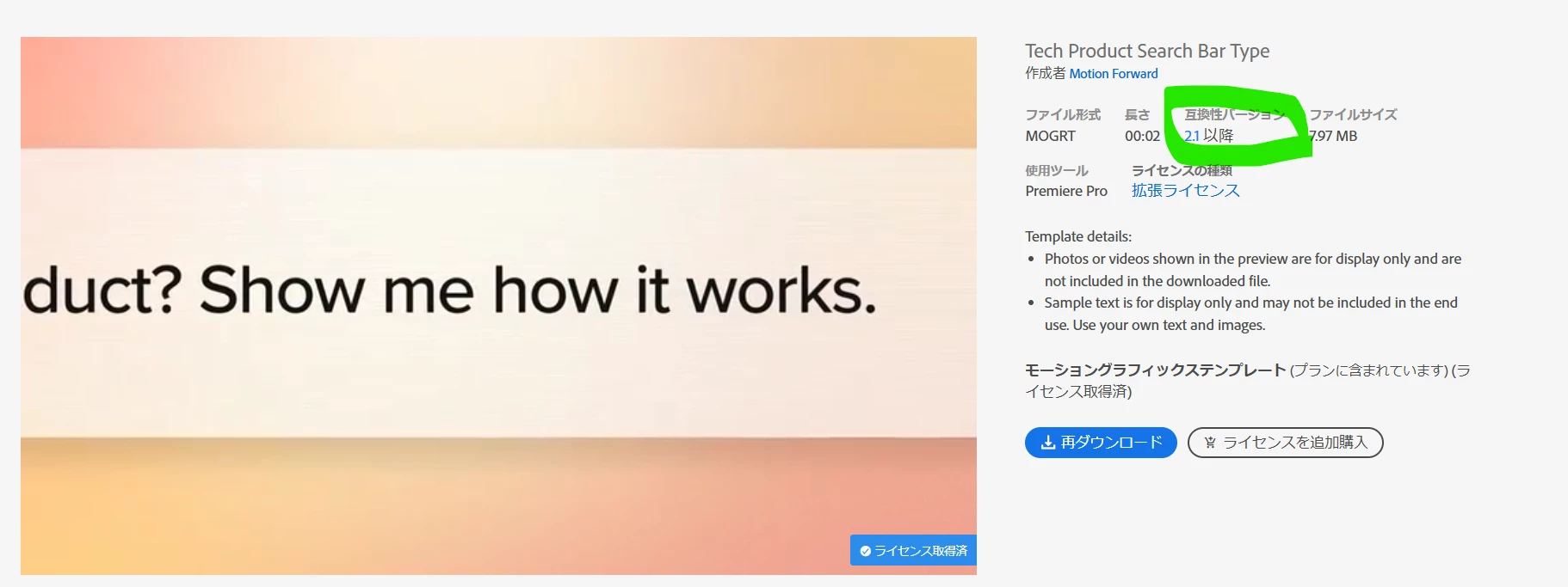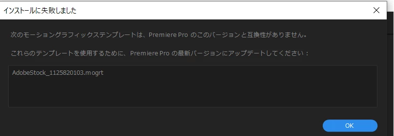 Adobe Stockで使いたいモーショングラフィックステンプレートがあり、DLしてPremiere Proに入れようとしたのですが、インストールに失敗しましたと表示され、Premiere Proの最新バージョンへのアップデートが促されます。