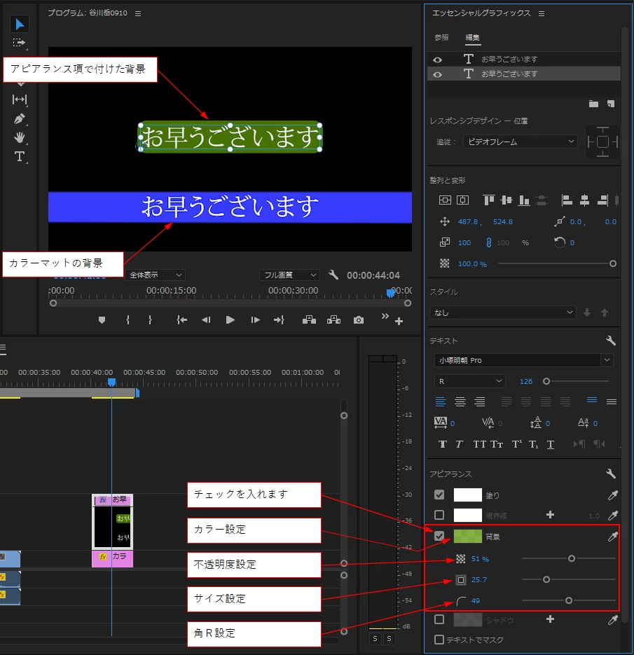 「アピアランス」項で、「背景」にチェックを入れると、背景が作成されます。カラー・不透明度・サイズ・角Rの設定ができます。不透明度・サイズ・角Rは、スライダーで視覚的に調整できますので便利です。。