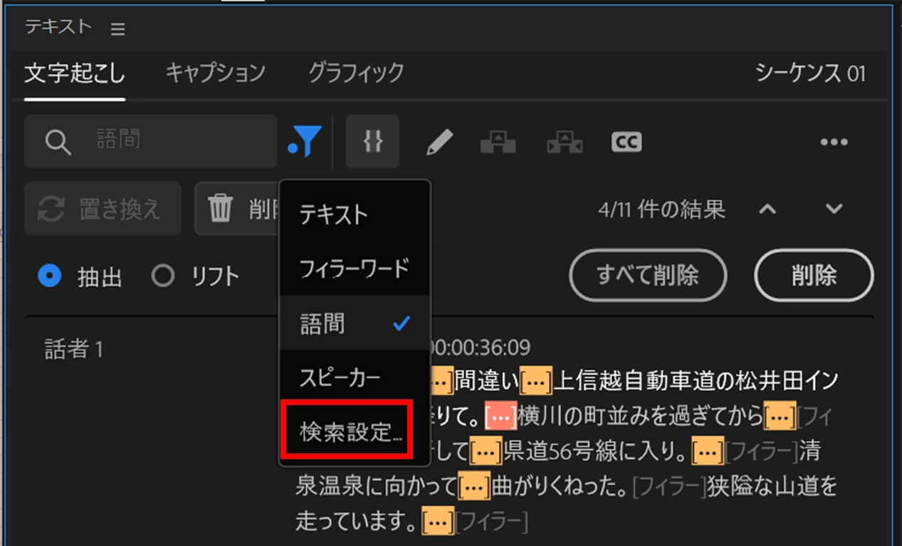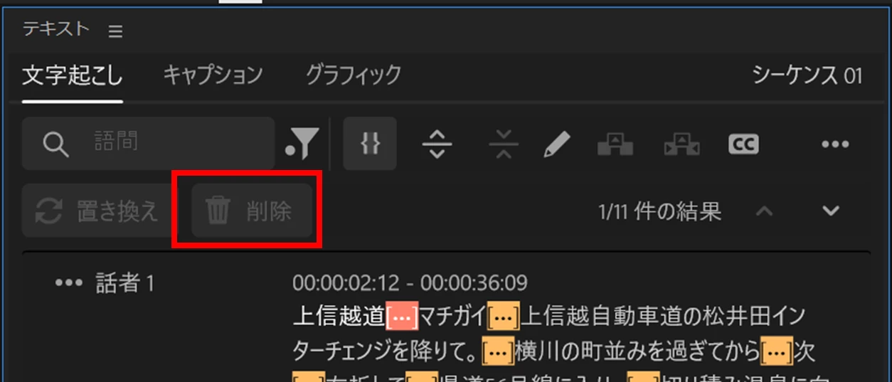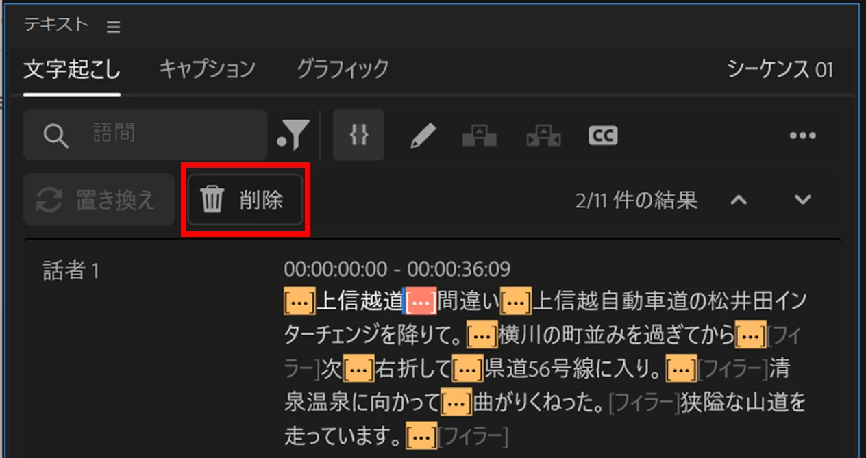 ③すると「文字起こしベースの編集」が行われます。今度は「フィルター」→「語間」を選択すると、「削除」ボタンはグレーになりません。「削除」ボタンをクリックします。
