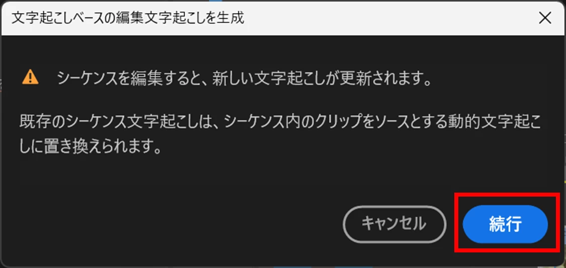 ②「文字起こしベースの編集文字起こしを生成」ウィンドウが表示されたら、「続行」をクリックします。