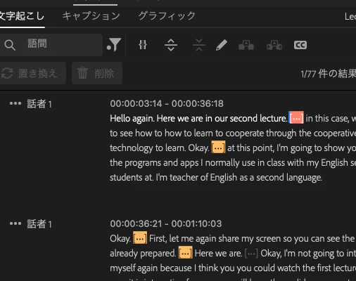 「語間」の削除を行うには、「文字起こしベースの編集(動的な文字起こし)」に切り替える必要があります。