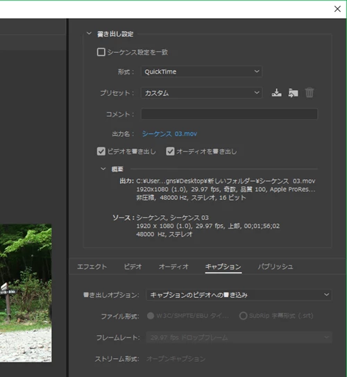 Premiere pro 2019、プリセット:Apple ProRes 422 HQでの字幕キャプション書き出し方法について