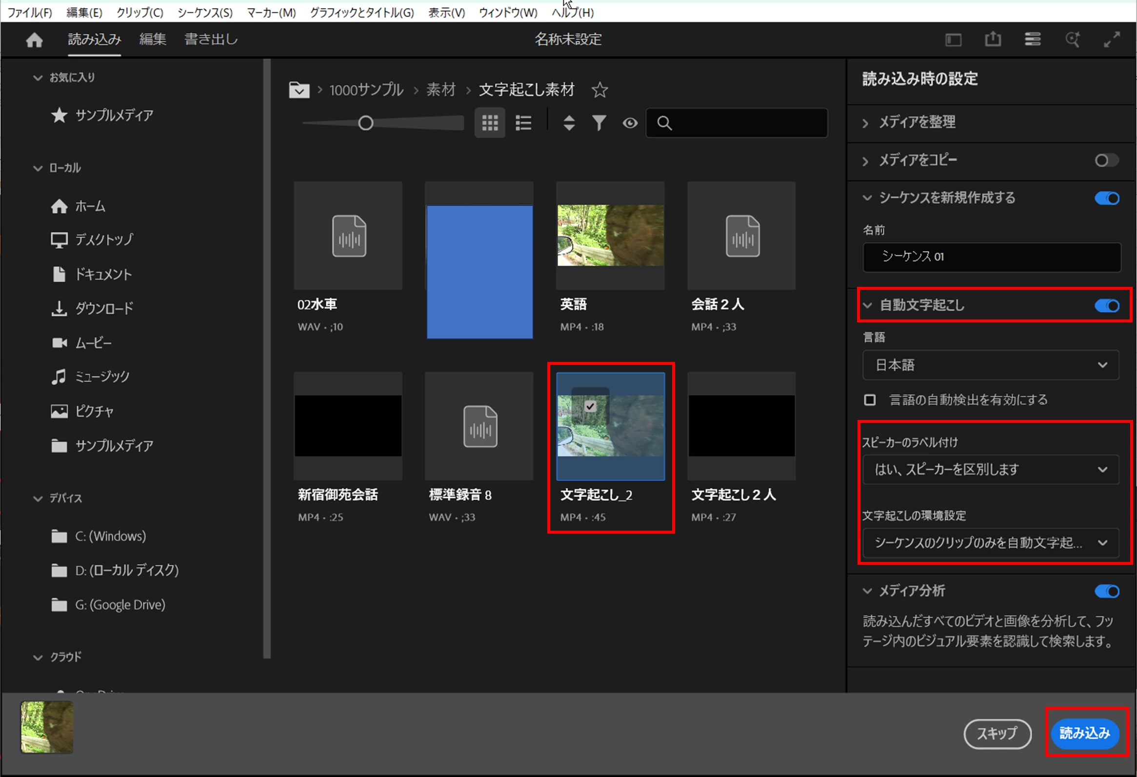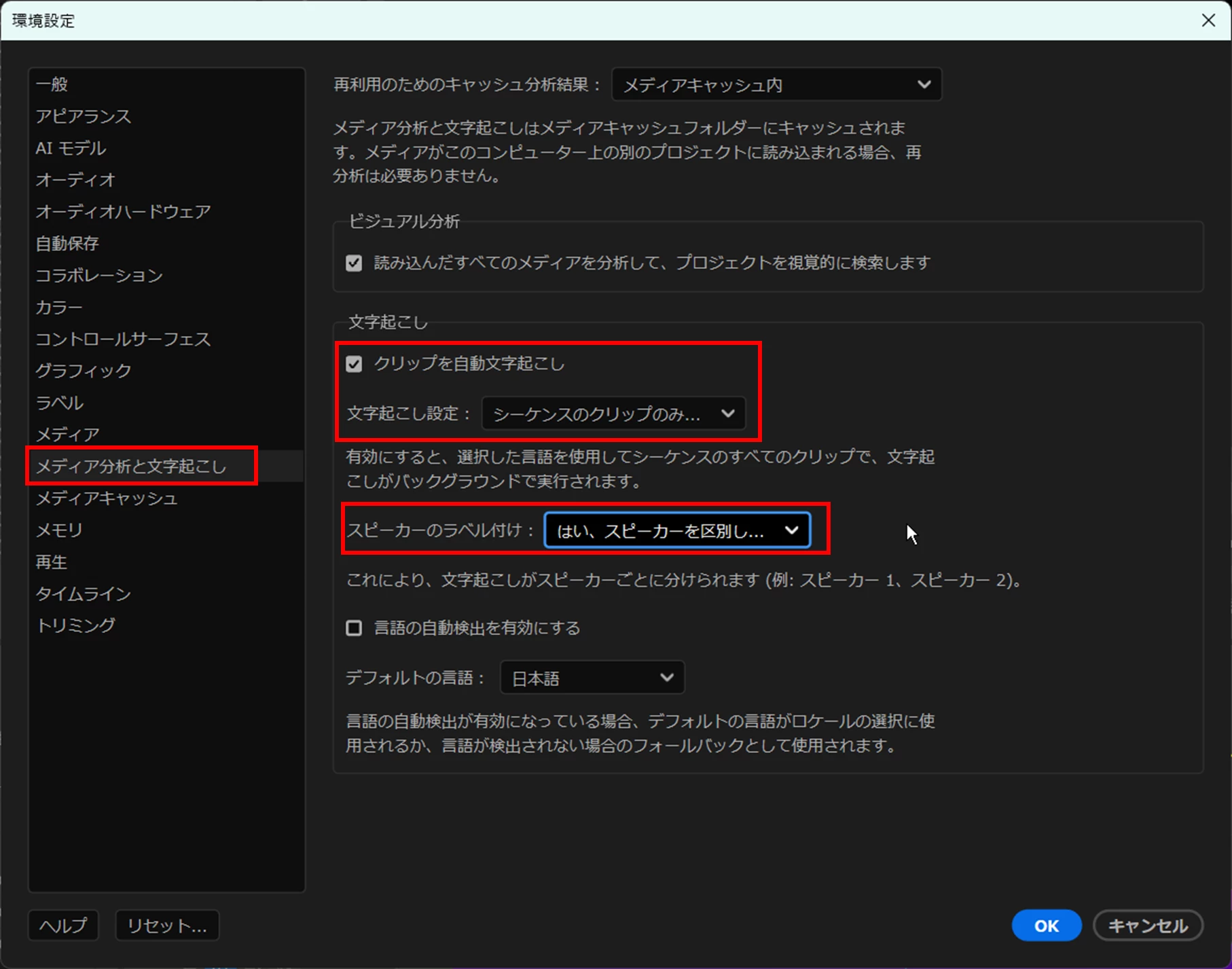 最新バージョンを使用しており、[環境設定]→[メディア分析と文字起こし]の設定も正しく有効になっています。