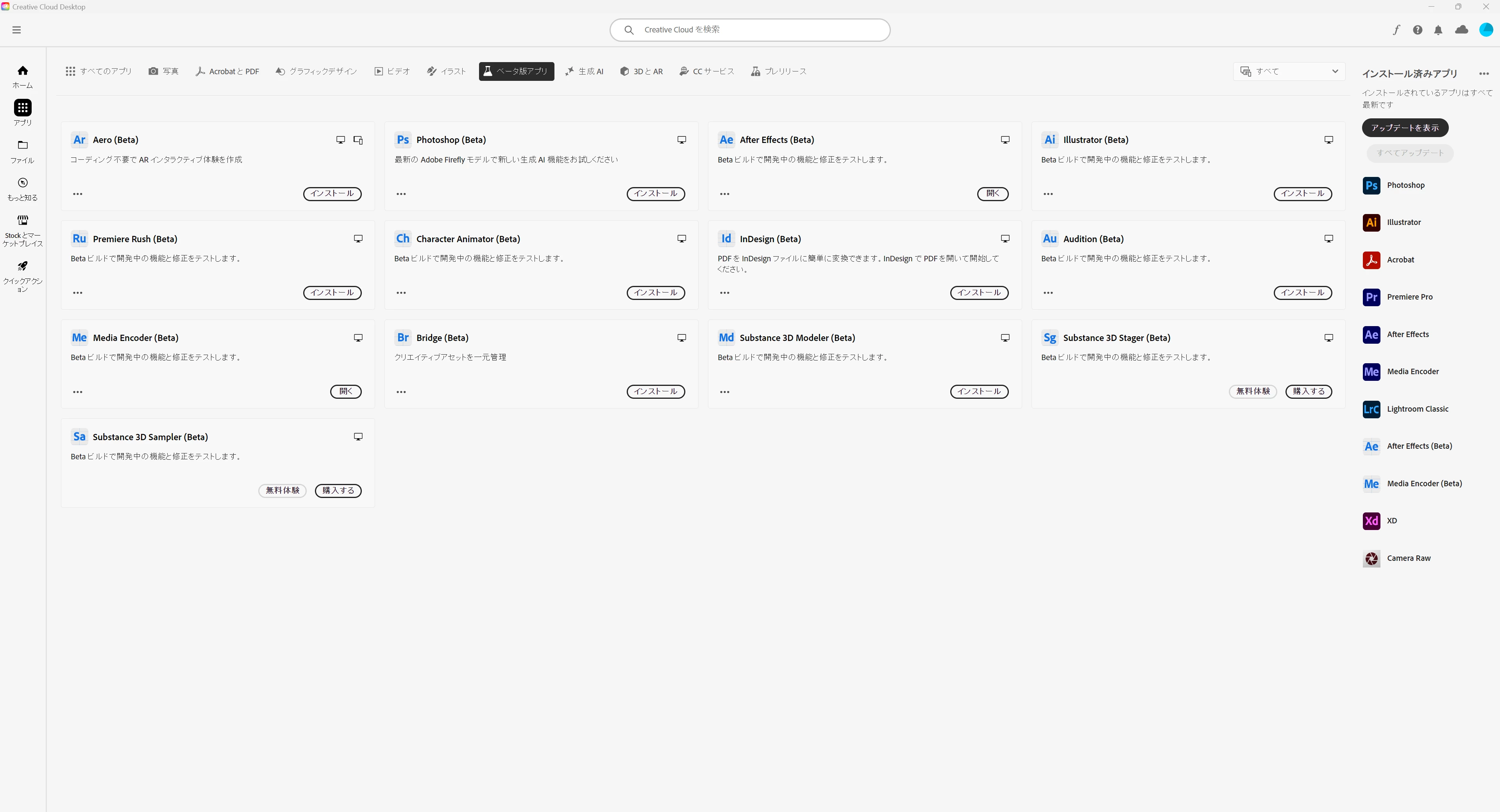 再度CleativeCloudからインストールしようとしたところ、項目にPremiere Pro (beta)の項目がありません。