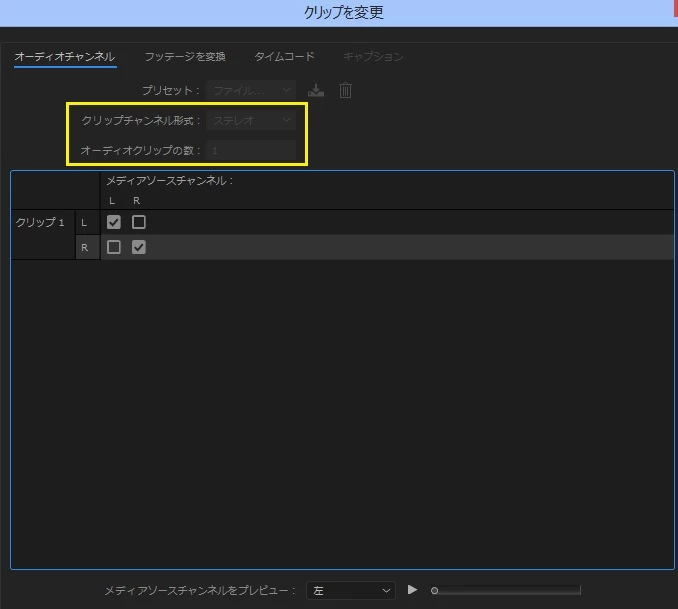 プロジェクトパネルのクリップを右クリック>変更>オーディオチャンネル