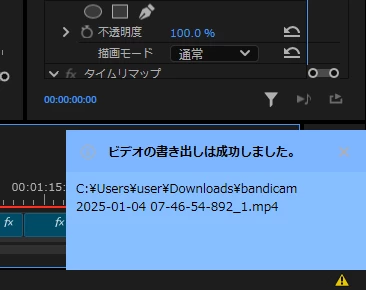 表題の通りで、「ビデオの書き出しは成功しました。」と出ますが、
