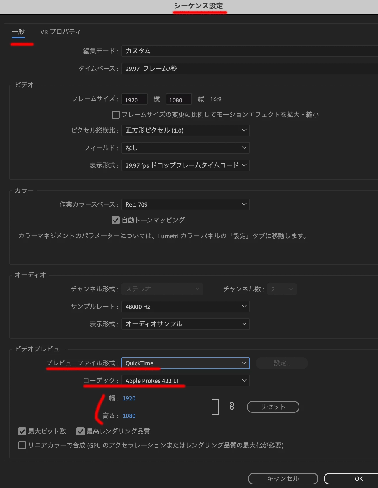 シーケンスのプレビューレンダリング直後で問題が起きやすいとのことですので、「シーケンス設定」のプレビューファイル形式をご確認いただくとどのようになっていますでしょうか。