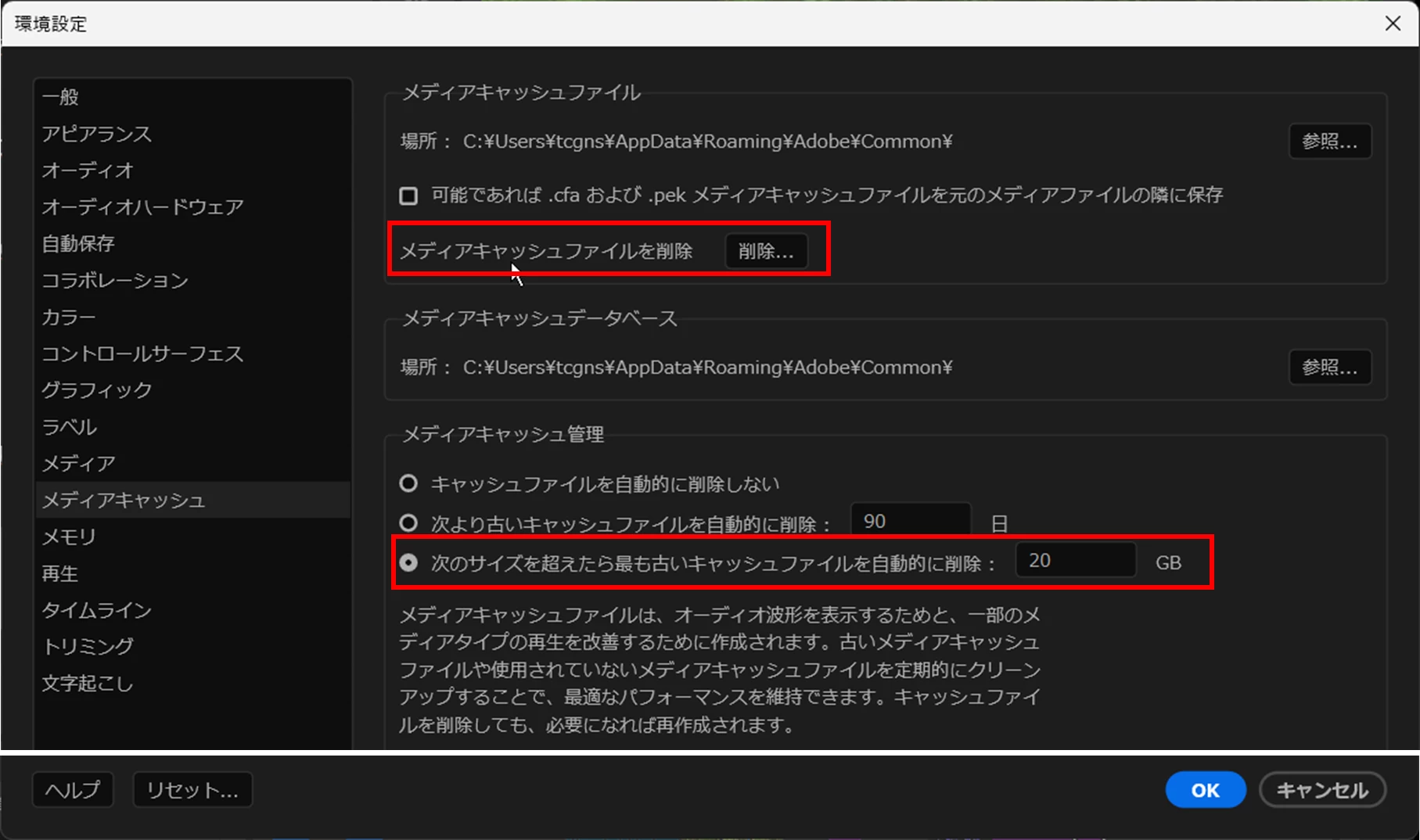 「環境設定」の「メディアキャッシュ」ペインの、「メディアキャッシュファイルを削除」項で「削除」を選択し、「OK」をクリックした後、Premiere Proを再起動します。