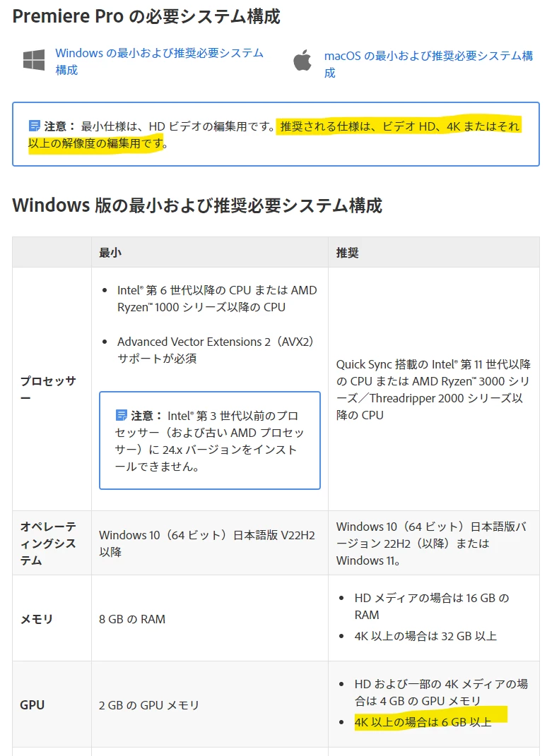 ちなみに自分もやむを得ずノートPCでPremiere Proで編集を行うことがあるのですが、4K動画で不安定だなと思って今確認したら、GPUはRTX3050TiでGPUメモリは4GBでした。