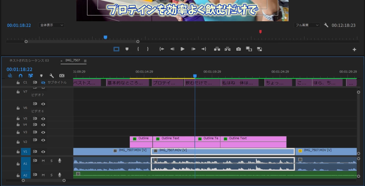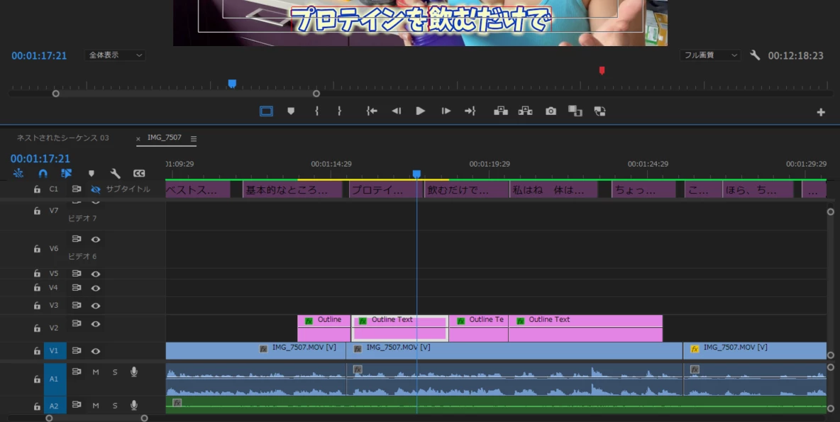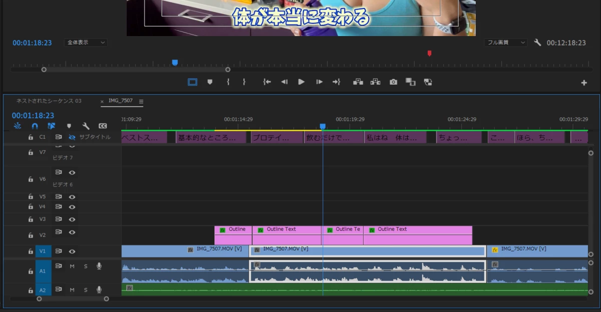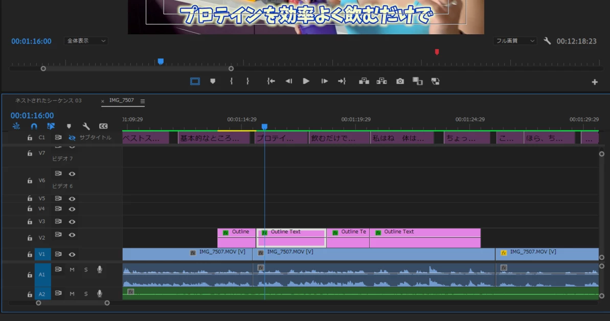 テロップを修正すると、そのクリップの最後(次のクリップとの継ぎ目)だけ、修正前の文が表示されます。再生すると、一瞬なので分かりづらく気づきにくいのが困りものです。