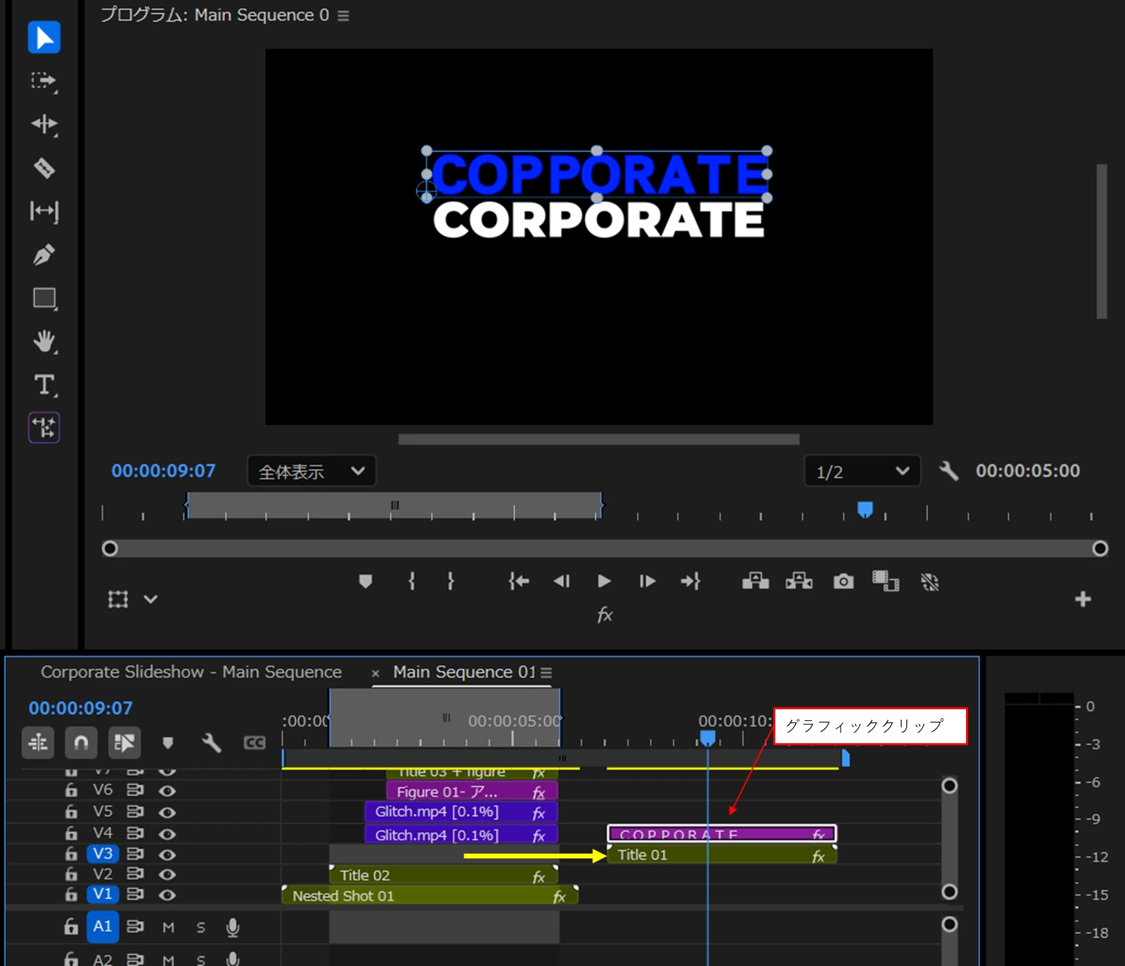 ⑤「グラフィックテンプレート」パネルの「モーショングラフィックステンプレート」をビデオトラックへドラッグ&ドロップします。