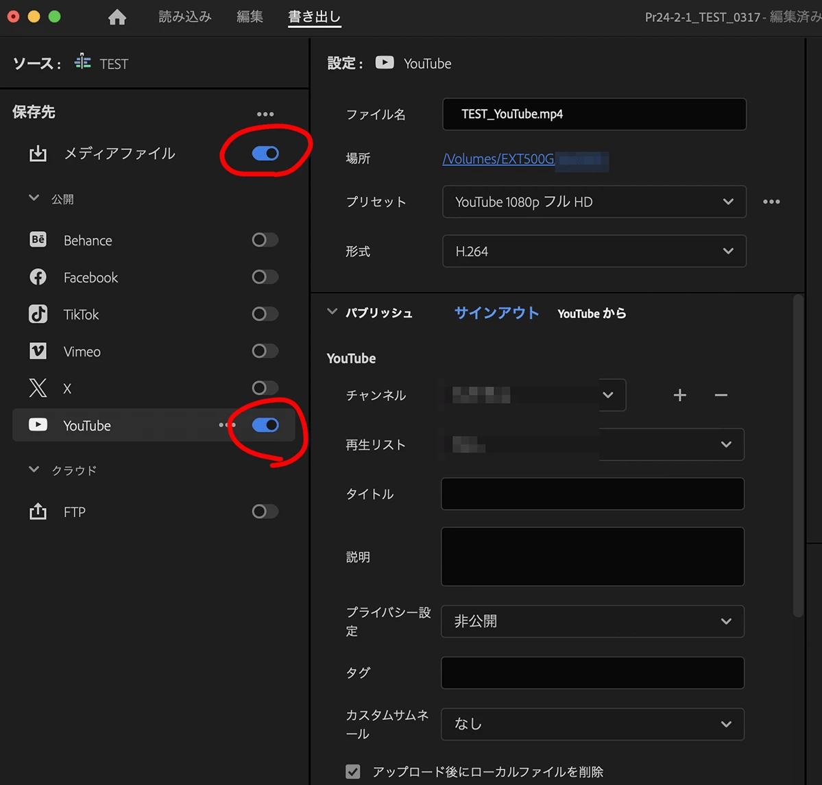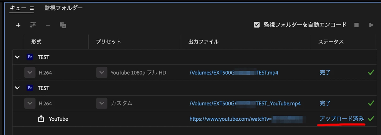 Premire pro →Media encorderで書き出し。一緒にYoutubeにもアップしたいがキューが2つ出る