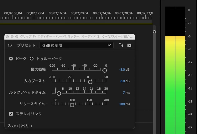 Premire Pro v25.0では、ハードリミッターの上限の設定が、-3.0dbずれており、おかしいです。