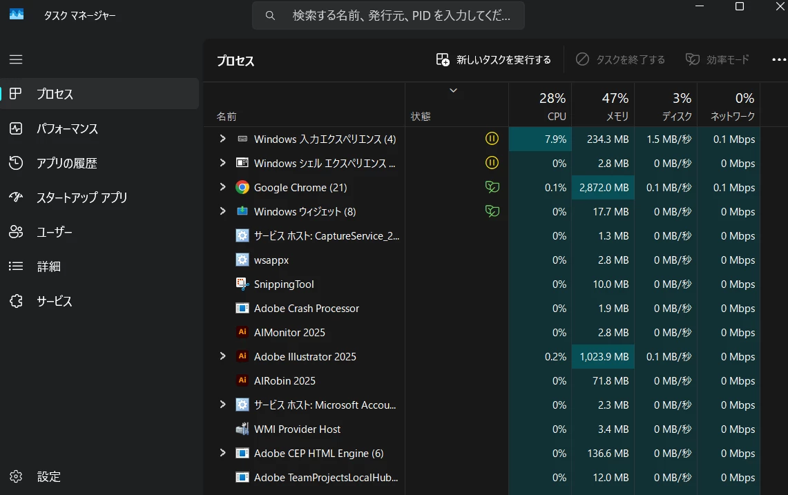 タスクマネージャーのスクショを添付します。