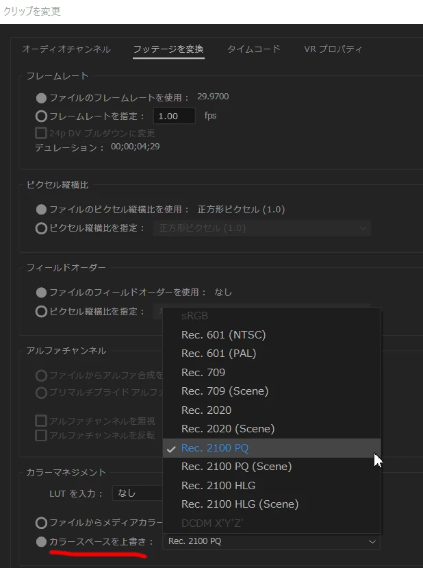 録画の方法によってはHDRの映像をSDRというタグが付いたファイルで収録される可能性もあると思いますので、その場合は手動でカラースペースを上書きする必要があります。