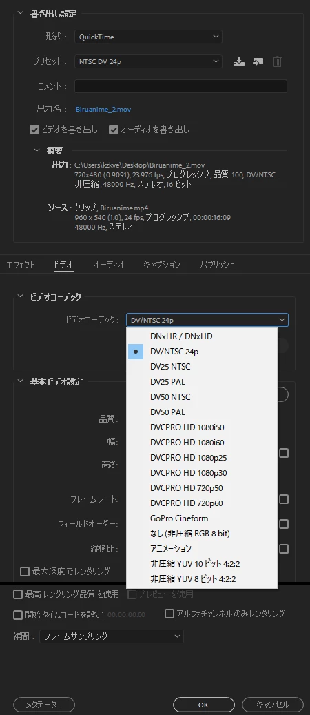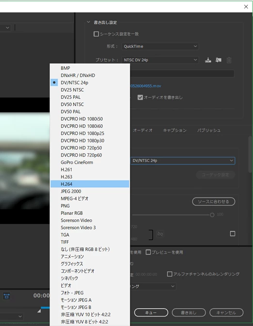 QuickTime形式のビデオコーデックのプルダウンメニューにH264がありません。