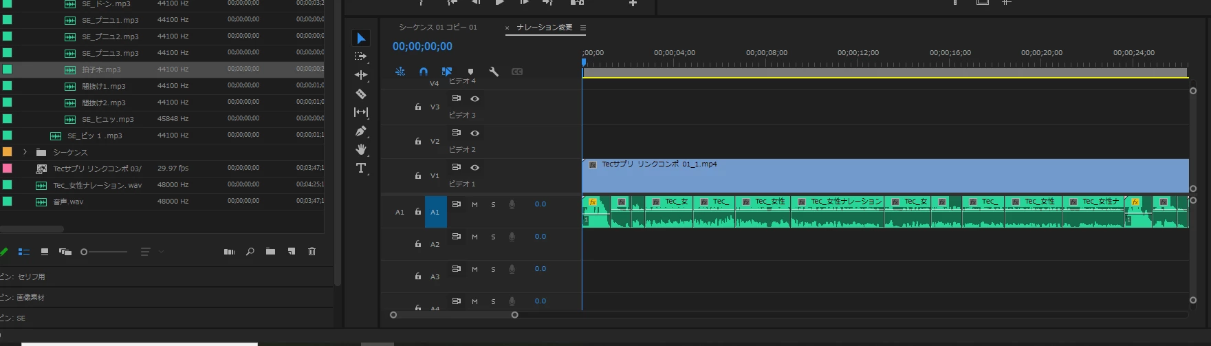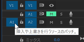 A1の音声クリップそれぞれの冒頭のタイミングでA2にSEを貼るという作業でしたら、SEをソースパネルで開いておき、シーケンスのトラックターゲットはA1のみON(添付している画像の状態でONになってます)にし、ソースのパッチはA2を選択し、あとは上書きのショートカットの「.」と次の編集点への移動のショートカットの「↓」を交互に連打すれば貼られてゆくと思います。