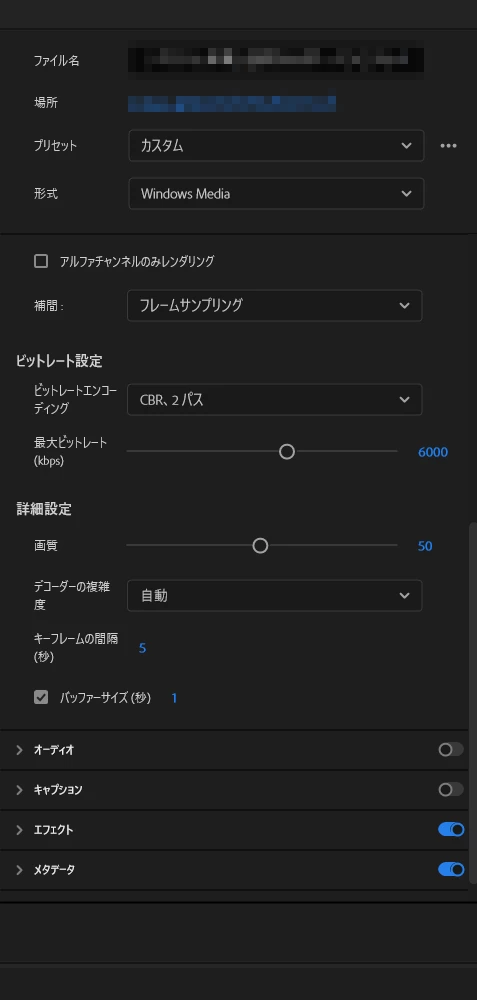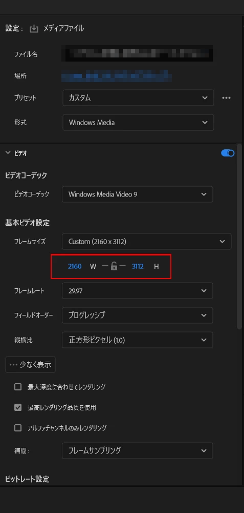 ※Adobe製品からのWMV書き出しの詳細な仕様を調べ切れておりませんため(そもそも公開されているか否かも不明です……)、他の設定と連動して3112より大きく設定することができるのか、そもそも仕様で制限されているのかなどは分かりません。