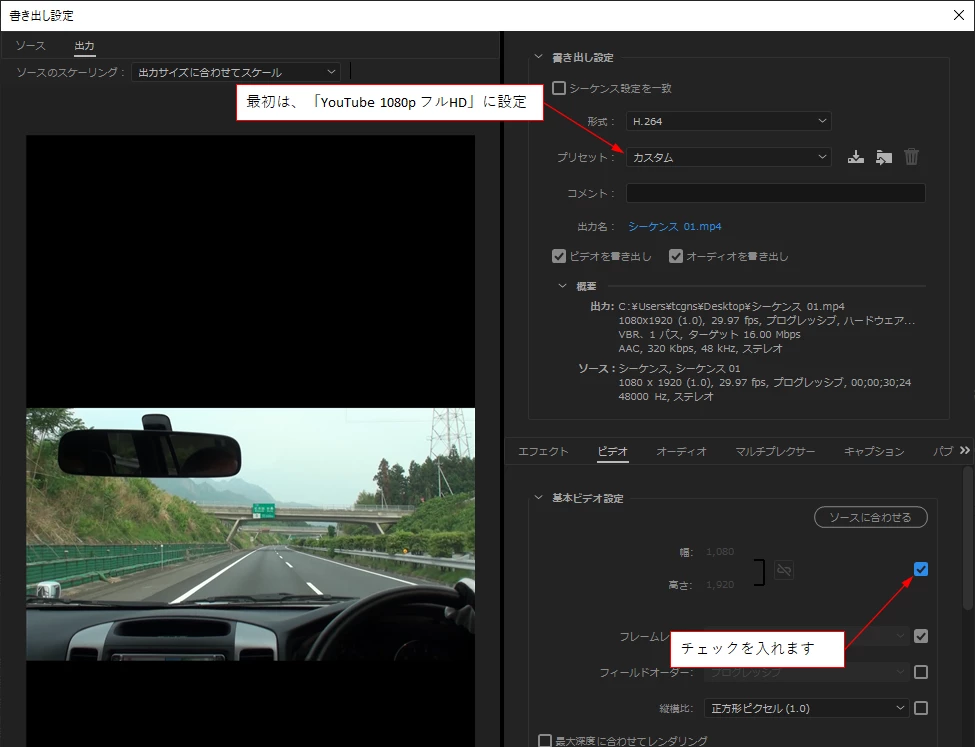 書き出しは、「youtube1080フルHD」で書き出しました。