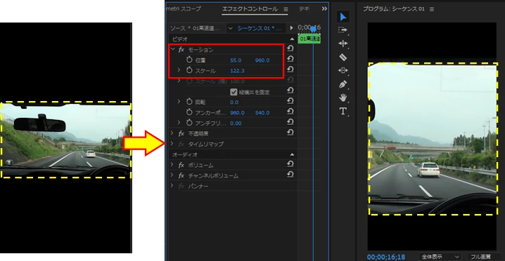 元々は横動画なので縦のサイズからははみ出してしまうのですが、見せたいのは中央の映像だけなので、動画を真ん中に持ってくるだけにしました。