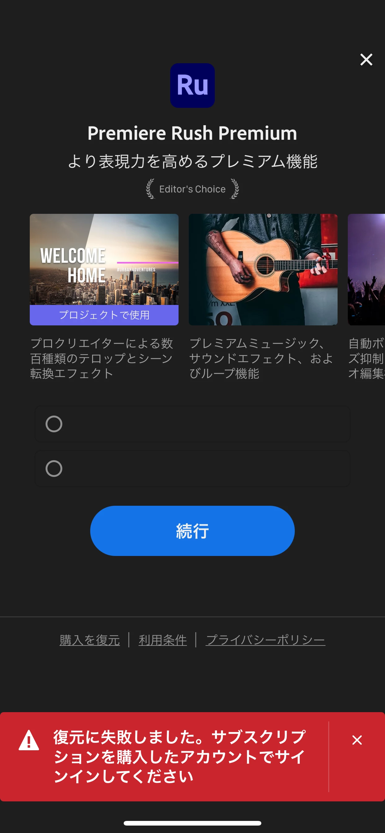現状(2026年2月18日)、Premiere Rushをダウンロードしていれば、無料の機能については利用できますが、プレミアム機能に関しては使えなくなっている、ということになります。