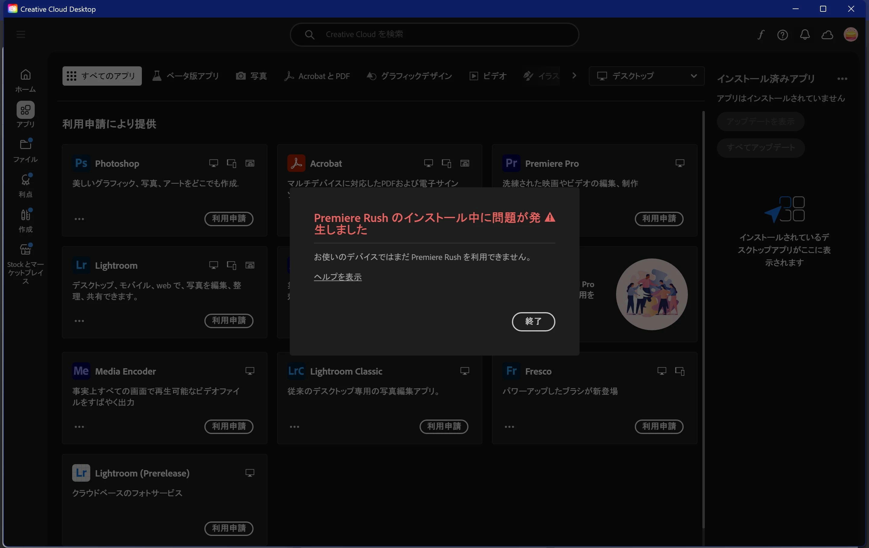 Creative Cloudより、PremiaRushのインストールをしようとすると、下記の画像のようなエラーとなります。どういった原因がかんがえられますでしょうか。OSはwindows11です。