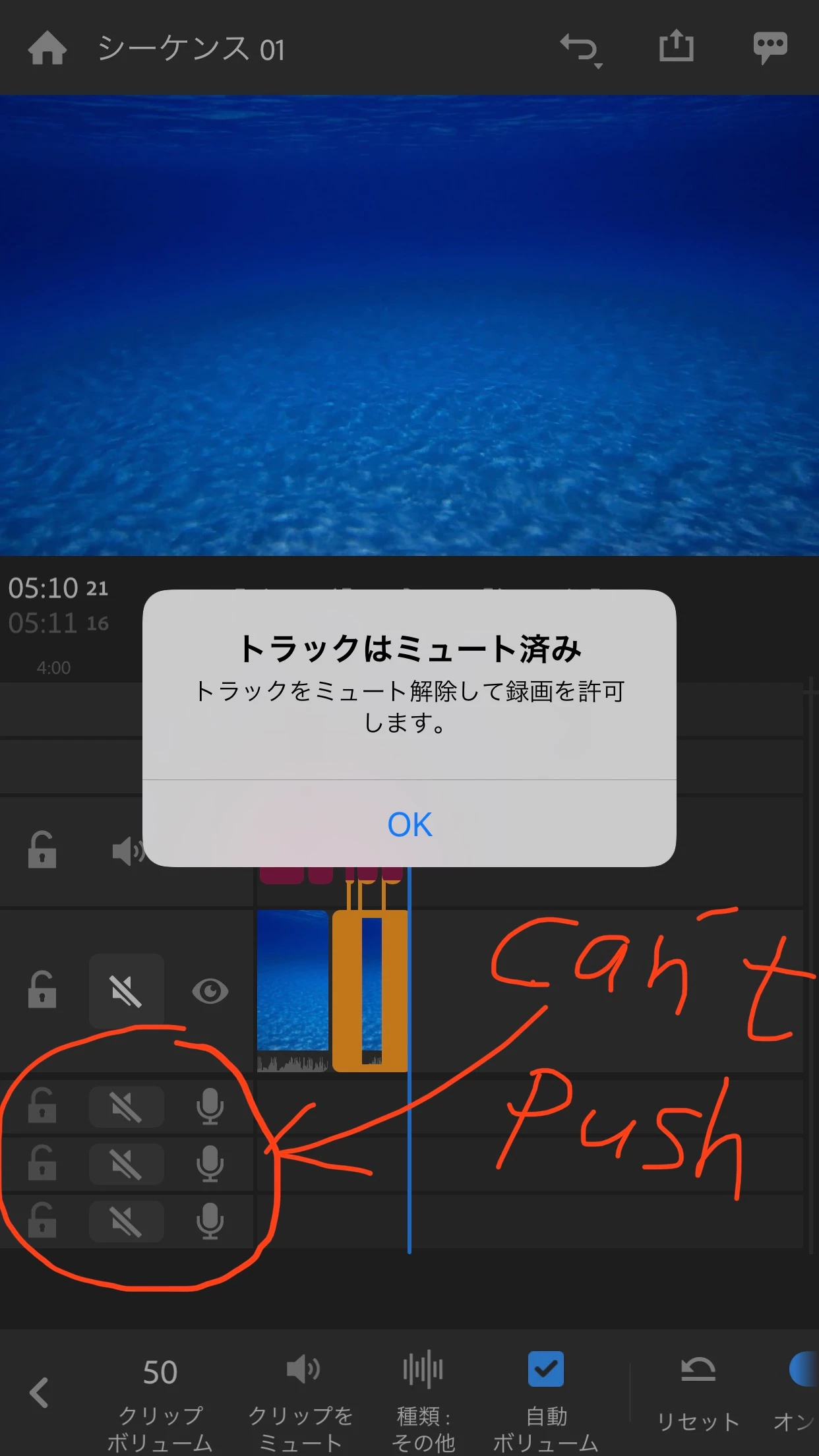 「トラックはミュート済み (トラックをミュート解除して録画を許可します) 」とメッセージが出て