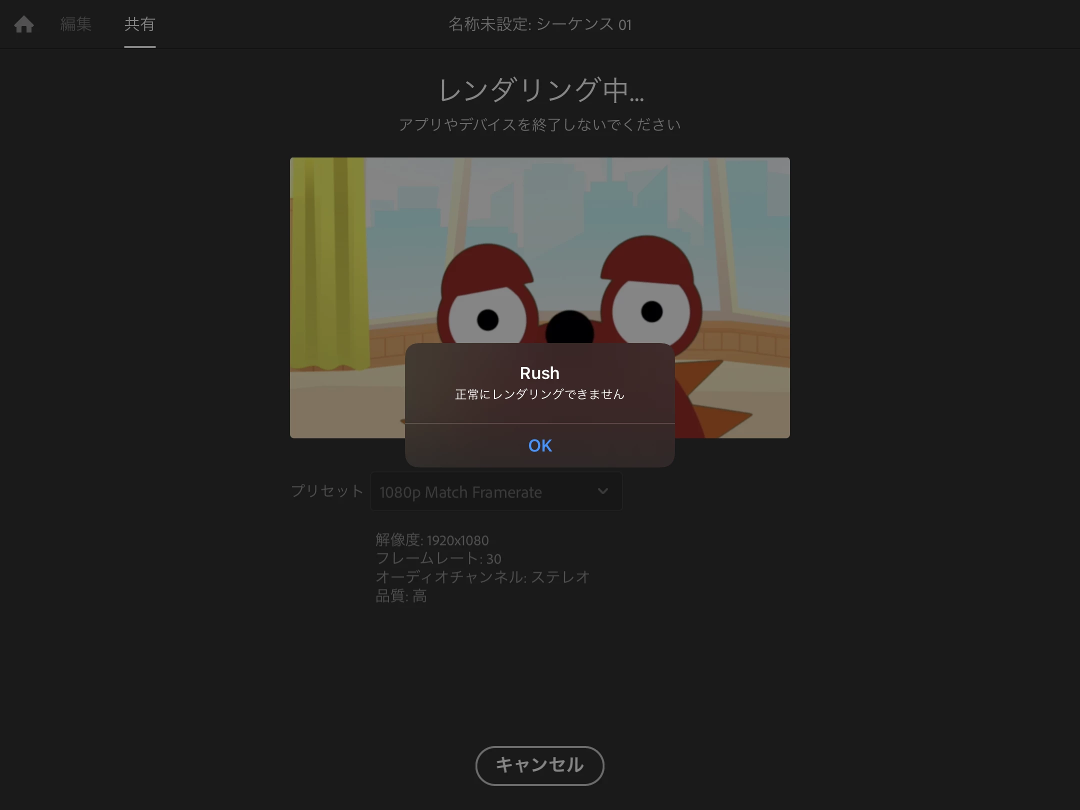 iPadのAdobe Premiere Rushで動画の書き出しをすると、開始数秒後に「正常にレンダリングできません」と警告が表示されてしまい、書き出しができません。詳細は添付画像をご参照ください。また、サポートコミュニティにすでに投稿のあった解決方法として、「画質設定を変更する」といったものがありましたが、いずれの選択肢も解決にはなりませんでした。