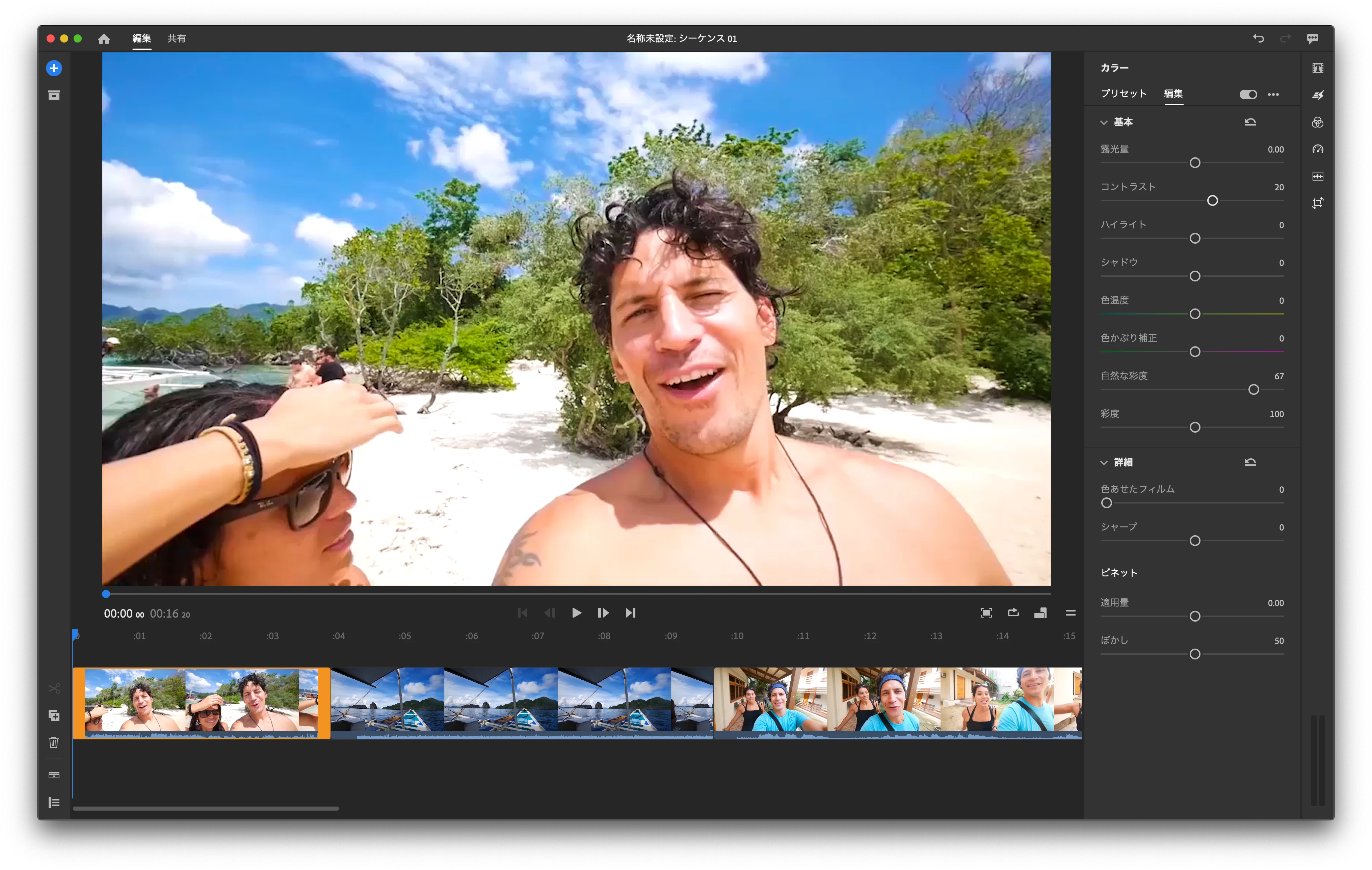 カラーの編集タブで、コントラストや自然な彩度、彩度あたりを調整することで、かなり青が鮮やかになったかと思います。