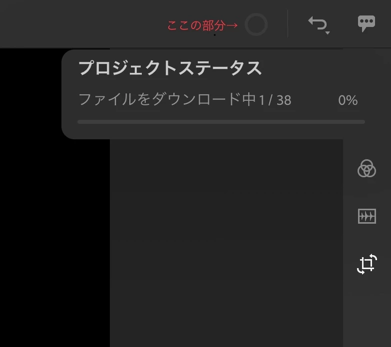 こちらは、この画像にあるように画面右上に丸いマークがあると素材がダウンロード中ということですので、その間は動作が重くなることもあるかと思います。