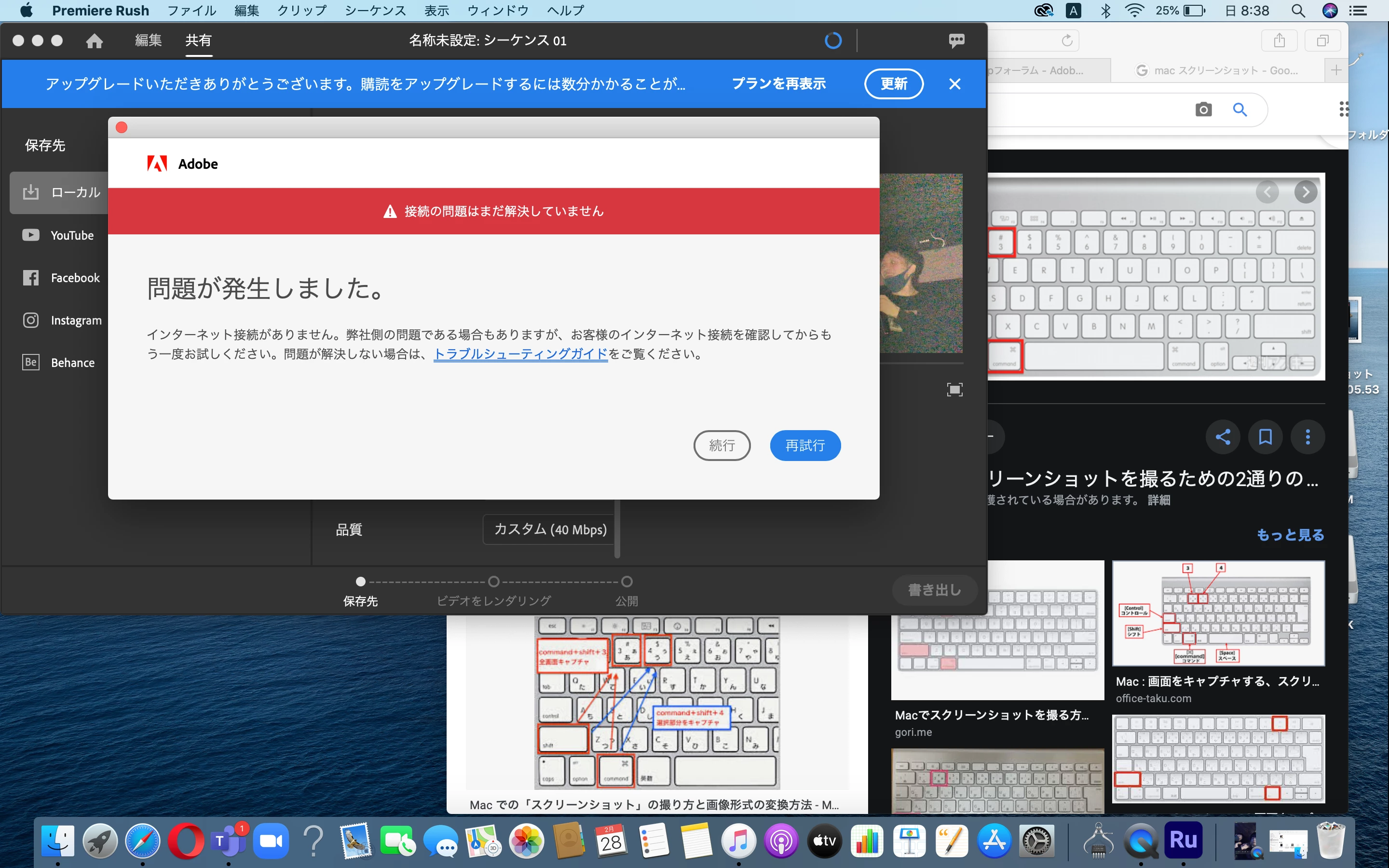 premire rush を年間プランで購入はしており、今まで書き出しは出来ていたのですが、急に添付画像のように書き出しに制限がかかってしまい、アップグレードをして更新というボタンを押すとインターネットにつながっていないと言う画面になってしまいます。wifi環境は今まで書き出しが出来ていたwifiと一緒なのですがなぜか急にこうなってしまいました。どなたか対処法についてわかる人おられますでしょうか。