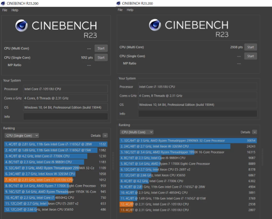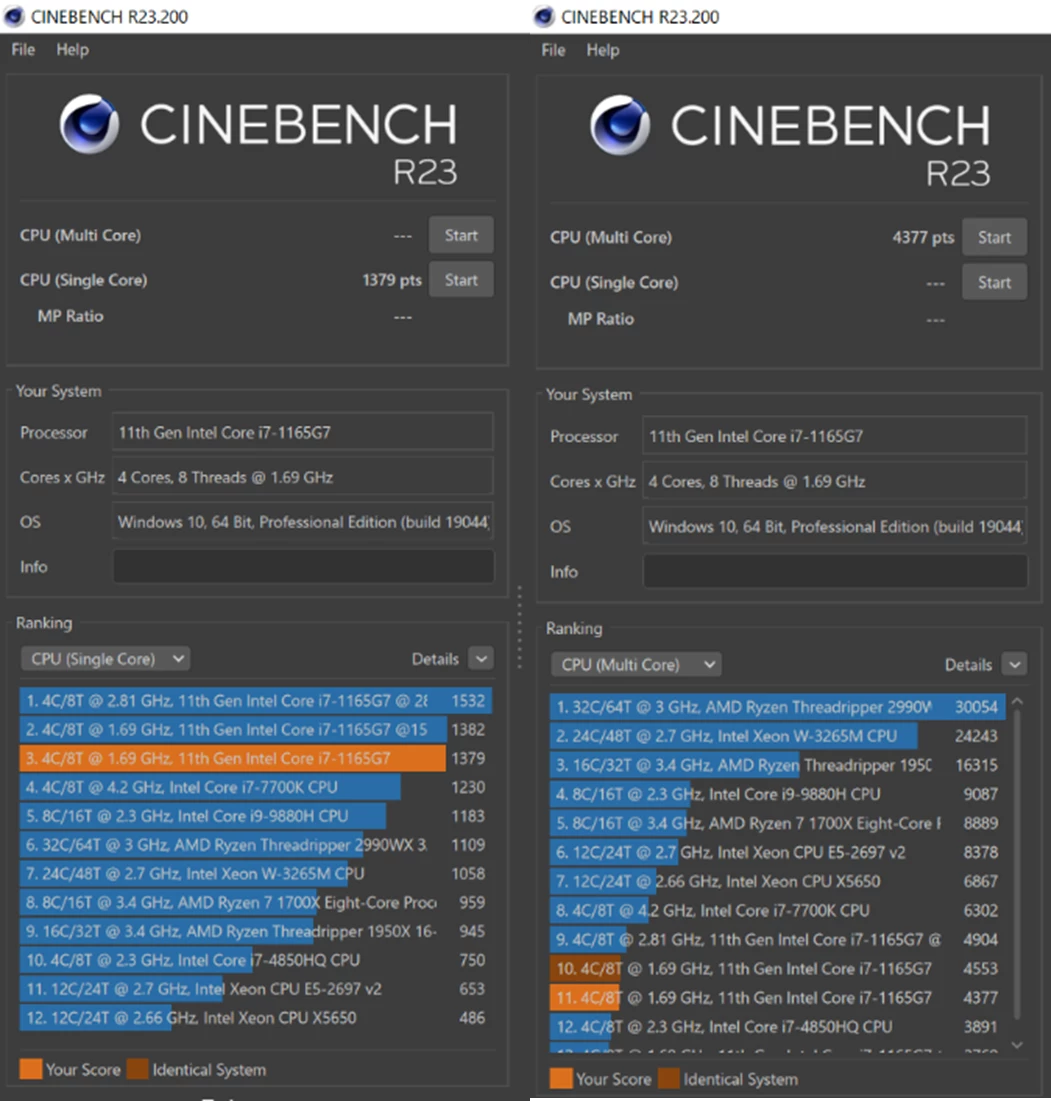 正常に動作している他PCと共にMAXONのCINEBEBCHをインストールしてCPUの性能を比較。