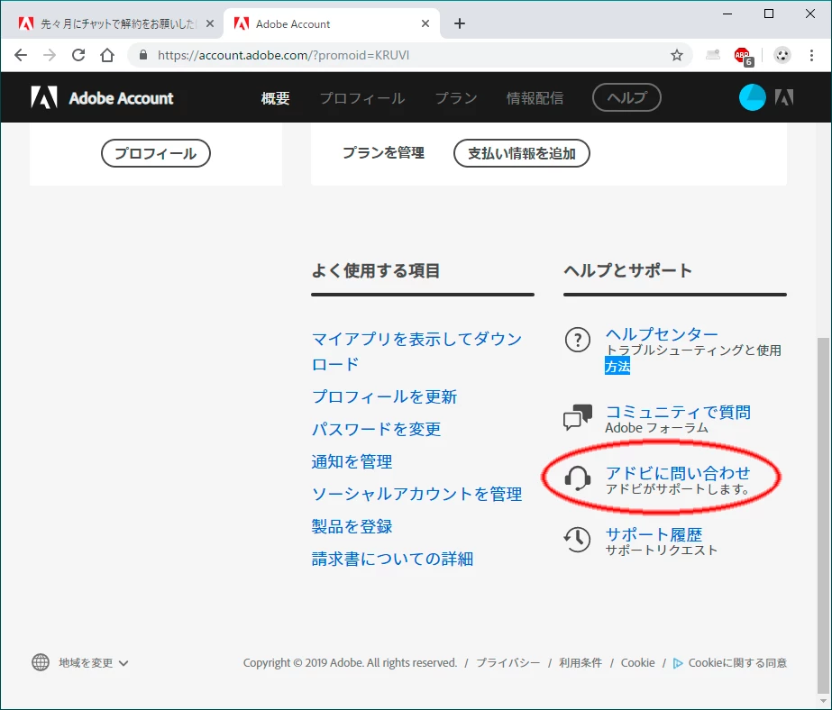 Adobeサイト(ホーム)で,契約していたAdobeIDでログインして「アカウント管理」から現在の状況を確認されるとよいと思います。そこからもチャットへ進めます。