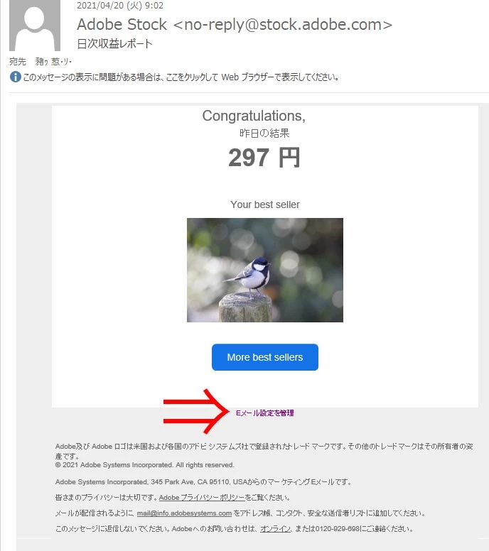 アドビストックのメールアドレス変更をしたいので、配信されたメールの下の方にある「Eメール設定の管理」をクリックしたが、メールアドレスを変更できる画面は、出てこない。