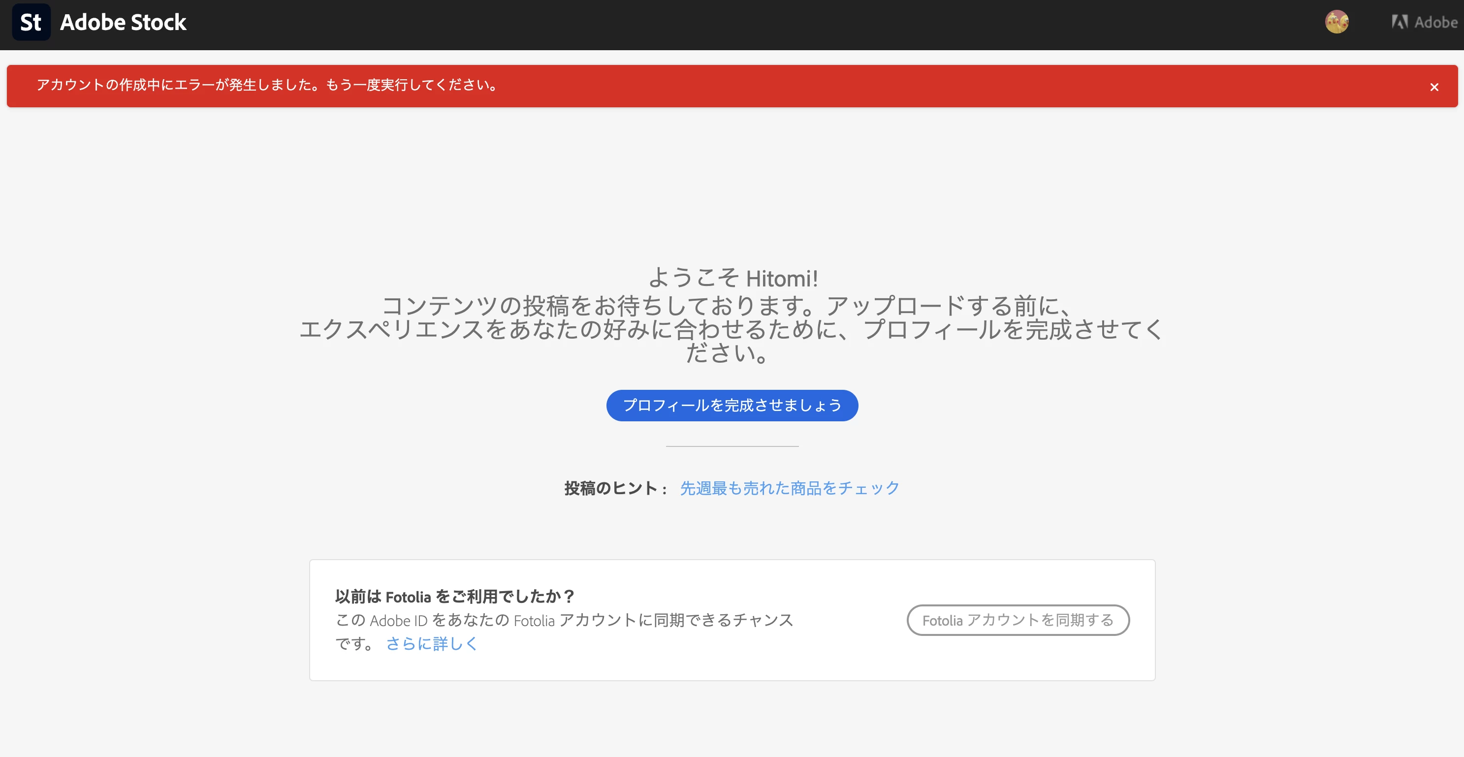 既存のアカウントでログインし、Adobe Stockコントリビューター登録をしましたが、プロフィール登録をしようとすると以下のようなエラーが出て進めません。