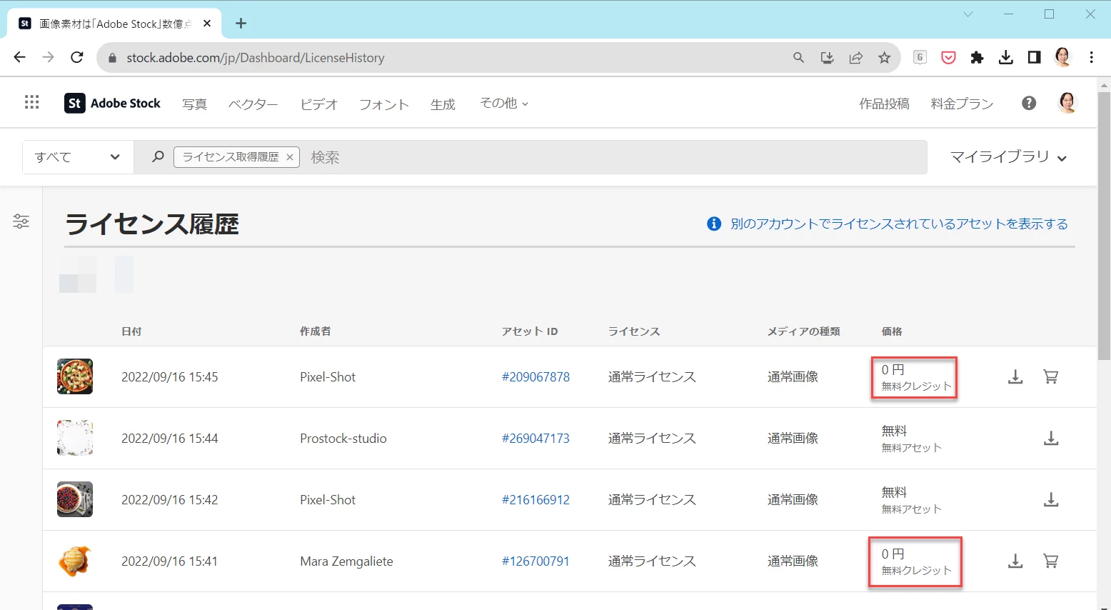 ささわ1582ParticipantForum|Forum|2 years agoSeptember 28, 2023QuestionAdobe stock 「無料アセット」と「無料クレジット」との違いForum|Forum|2 years agoSeptember 28, 20232 replies3835 viewsAdobe stokで無料の画像を何件かダウンロードいたしました。「ライセンス取得履歴」にて今までダウンロードしたものが見られるようですが、その中で「無料アセット」と「無料クレジット」という2つの表記があることに気が付きました。この2つの違いは何でしょうか。 間違えて「1ヶ月無料キャンペーン」等に申し込んでしまったのか?と不安になっています。私は会社で利用しているので、気づかないまま会社の経費を使っているとしたら、早急に対処しなければならないので…ライセンス認証中プランと購入