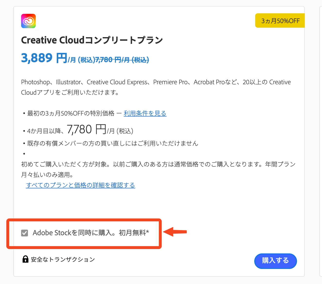 「プランに含まれる主なアプリ」の中にAdobe stockが含まれています。
