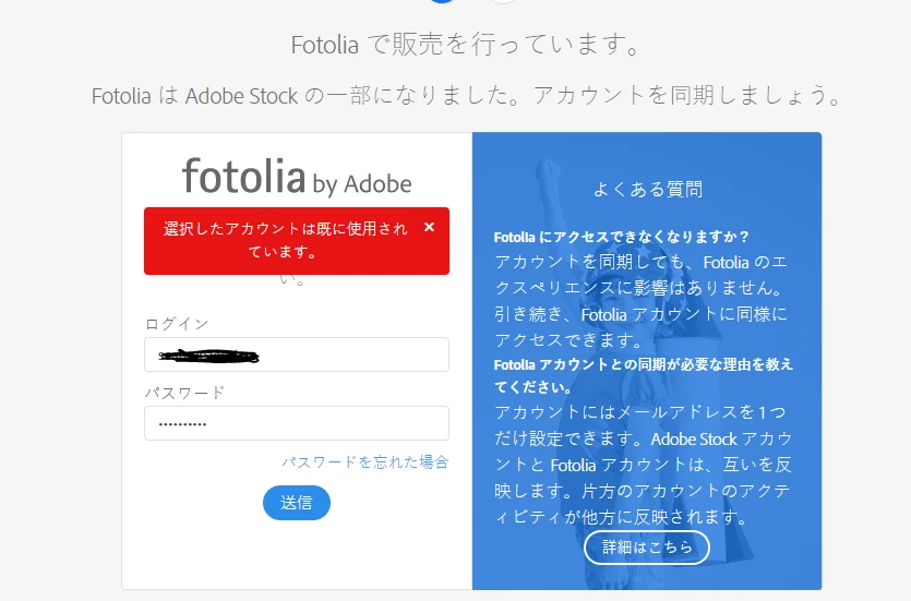 以前、Adobeに移行する際に同期したものと思っていましたが、税金申告のメールを受けてアカウントに接続しようとしたところ選択されたアカウントは既に使用されておりますと表示されてしまいます。少量ながらも販売されたメールは来るのでアカウント自体は生きていると思うのですがログイン出来ないので(同期出来ない)先に進めません。以前同様の質問をされた方がいらっしゃいますが、fotoliaのページのContact usに飛ぶようにリンクが貼られていましたが今はAdobe stockに飛びそのページもありません。チャットで問い合わせてもその項目も出て来ず対処のしようがありません。同じような現象に遭われた方はどのように対処されましたでしょうか?