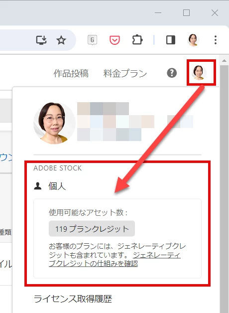 現在の残りクレジット数は、Adobe Stock( https://stock.adobe.com/jp/ )にブラウザでアクセスし、画面の右上のアカウントアイコンから確認できます。