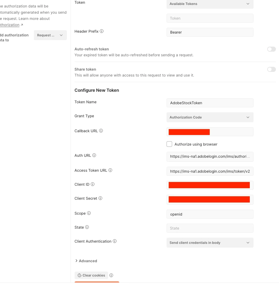 • Auth URL: https://ims-na1.adobelogin.com/ims/authorize/v2