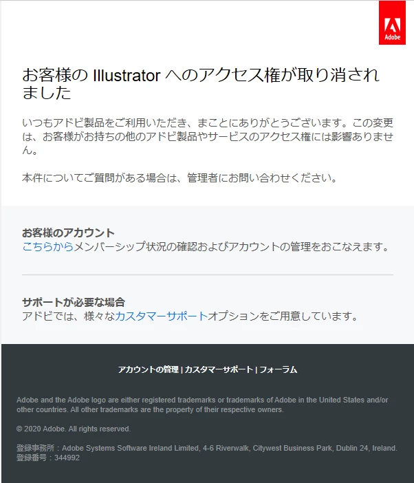 お客様の Illustrator へのアクセス権が取り消されました