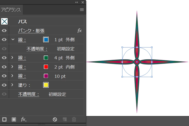 イラレの効果「パンク・膨張」を使って、円のオブジェクトをキラキラマークに変形し、