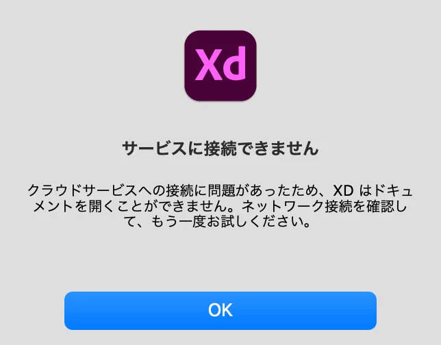 キャンセルを押すと、"クラウドサービスへの接続に問題があったため、XD はドキュメントを開くことができません。ネットワーク接続を確認して、もう一度お試しください。"と出ます。