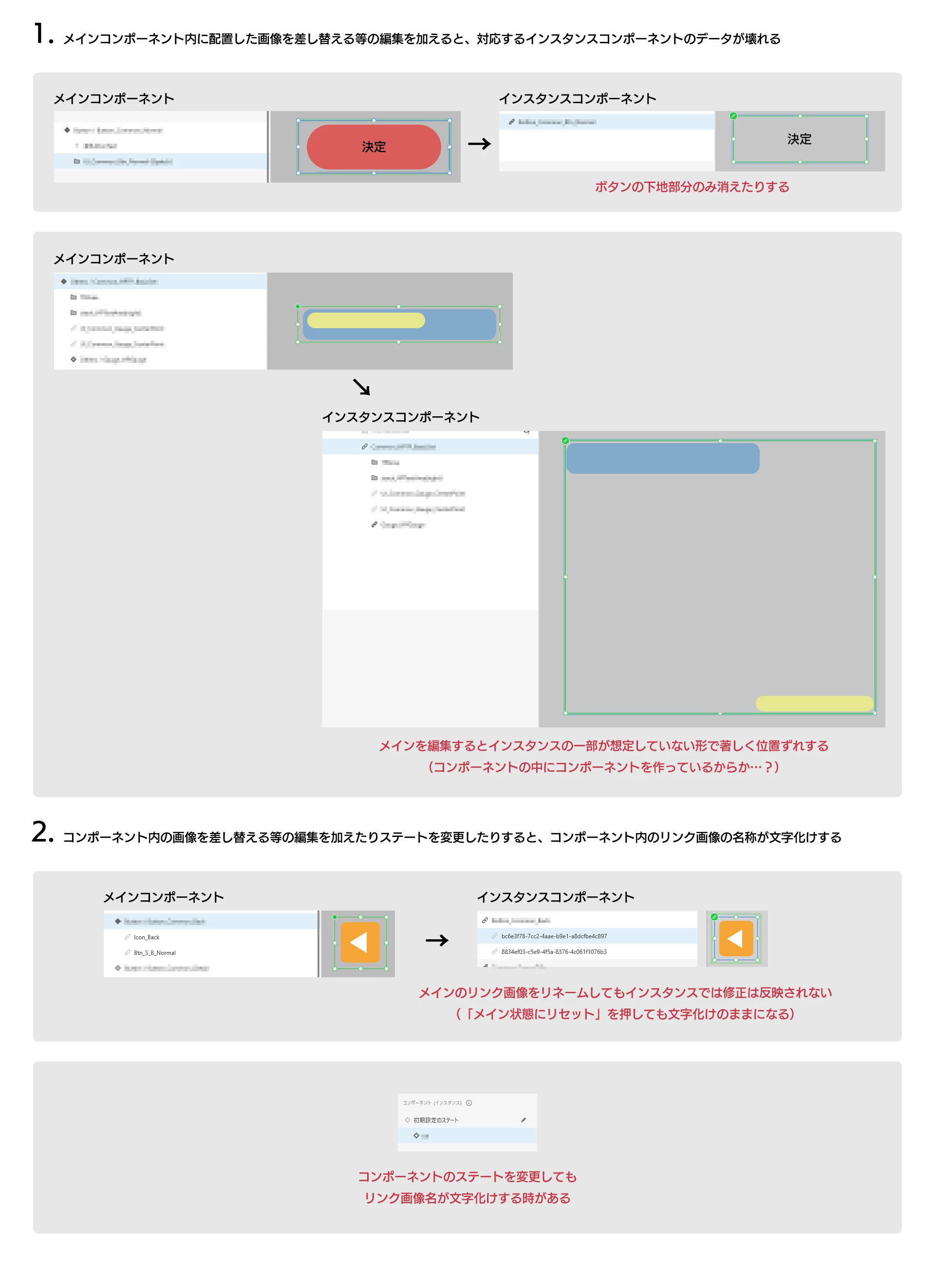 ②コンポーネント内のリンク画像を差し替えたりステートを変更したりすると、コンポーネント内のリンク画像の名称が文字化けする