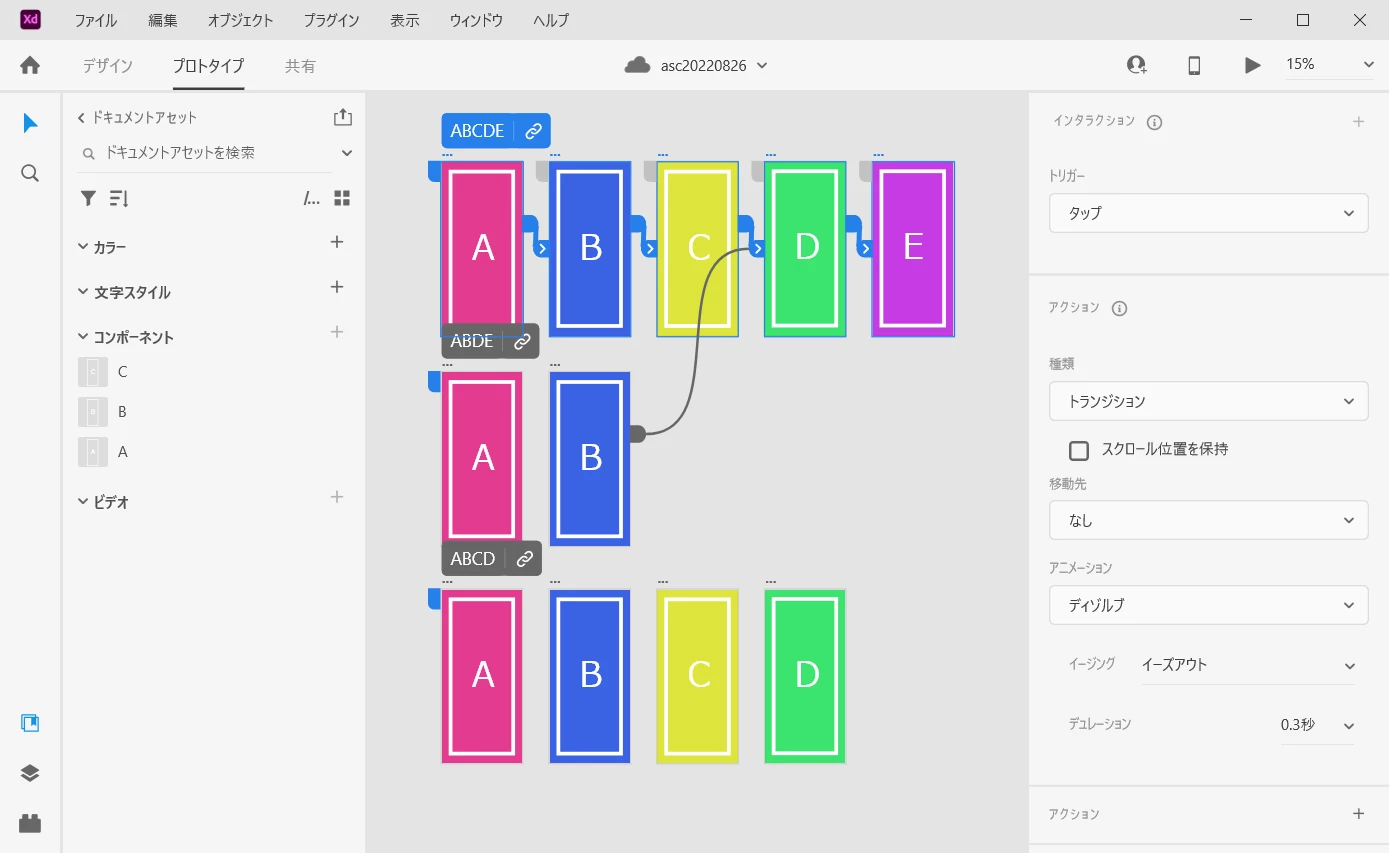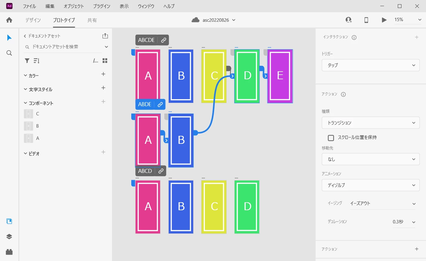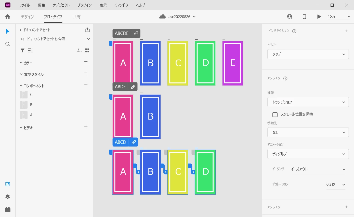 XDにて画面を5つ作成しました(A,B,C,D,E)。