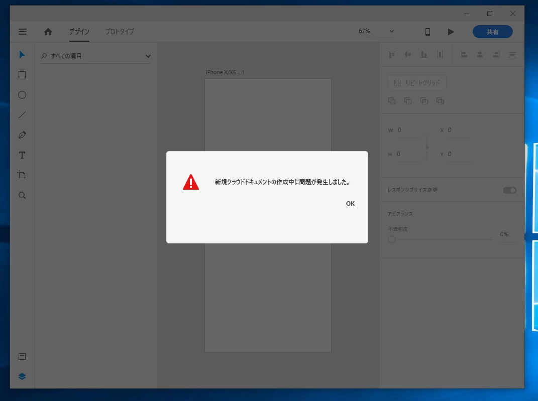 新規で作成しようとすると、上のキャプチャのように「新規クラウドドキュメントの作成中に問題が発生しました。」というエラーが毎回表示されます。