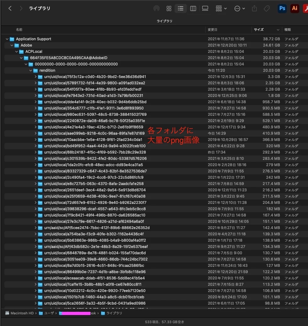 Mac OS12です。ユーザ>ユーザー名>ライブラリ(不可視)>Application Support>Adobe>ACPLocal以下の英数字のフォルダのrenditionというフォルダ内にXDの作業データのアートボードを書き出したpng画像が大量に入ったフォルダがXDドキュメントごとに生成されています。多いものでpng画像が1万項目入ったフォルダもあり、XDドキュメント数で変動するんだと思いますが、合計で20GB程にもなっています。この大量のpng画像の入ったフォルダはどんどん増えていくのでしょうか?削除してもいいものでしょうか?
