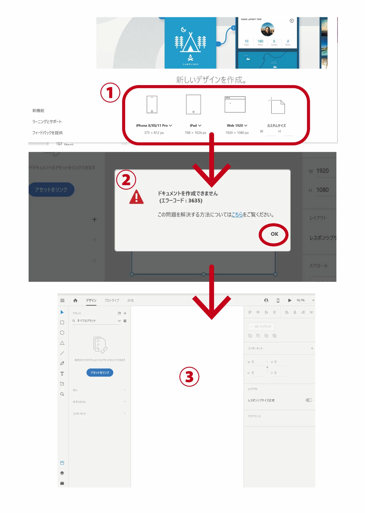 ②エラーコードが表示されます。ここでの解決方法のリンクは既に試してダメだったので、OKをクリックすると、背景にアートボードがあったはずが、消えて、