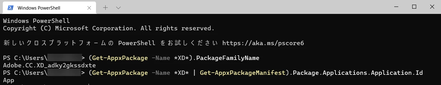(Get-AppxPackage -Name *XD*).PackageFamilyName