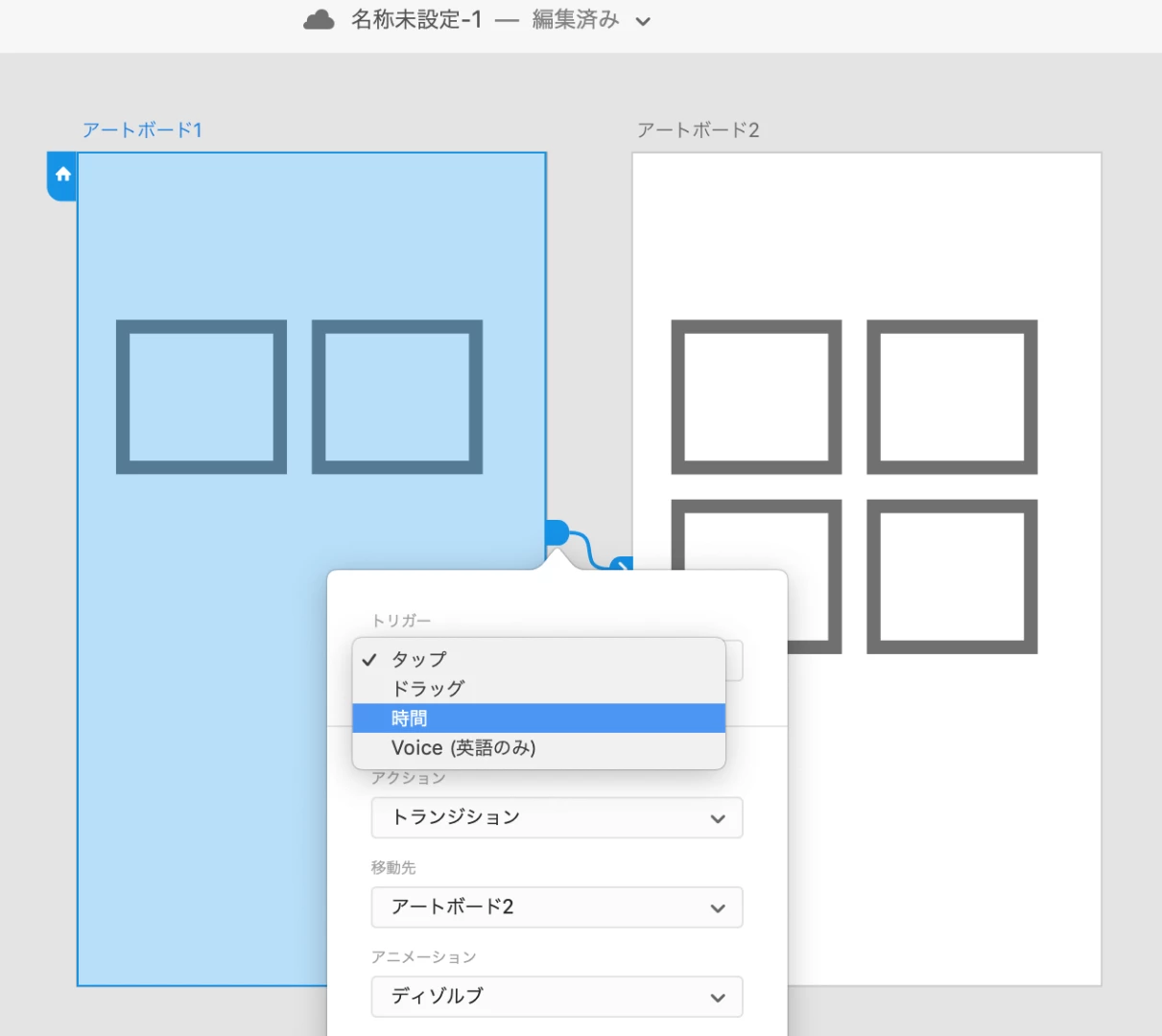 Adobe CCでXDを使用しています。2018年9月以降にアップデートされた「時間」(タイマートラディション)の機能を試したくて、探しているのですが、プロトタイプ編集画面のトリガー内に「時間」が表示されていません。皆様はどのようにして使われているのでしょうか?